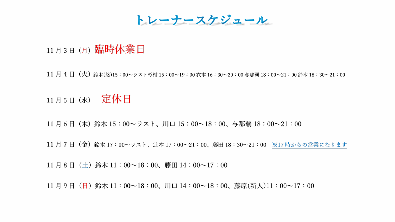11月3日(月)〜11月9日(日)までのトレーナースケジュールになります!