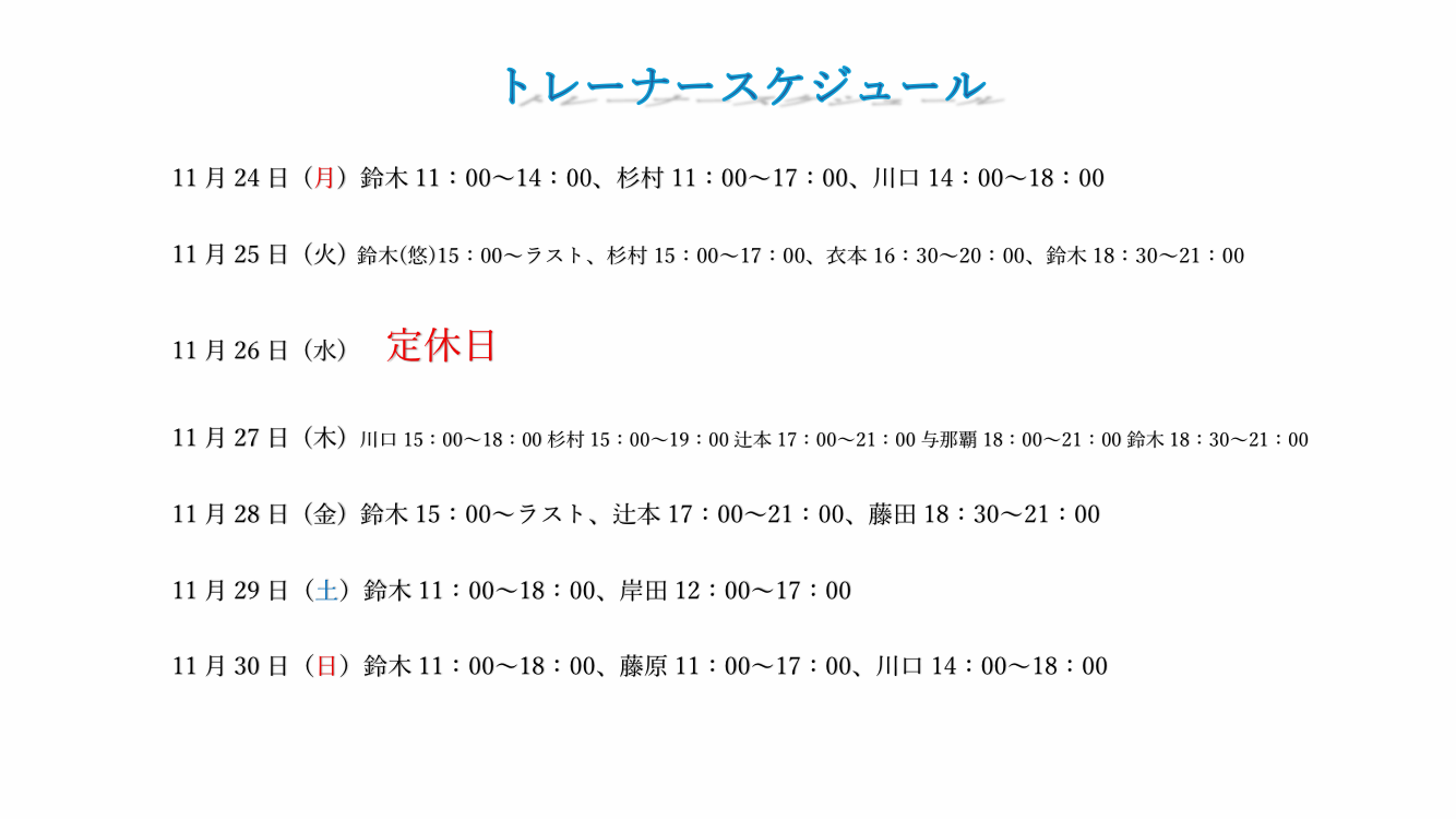 11月24日(月)〜11月30日(日)までのトレーナースケジュールになります!