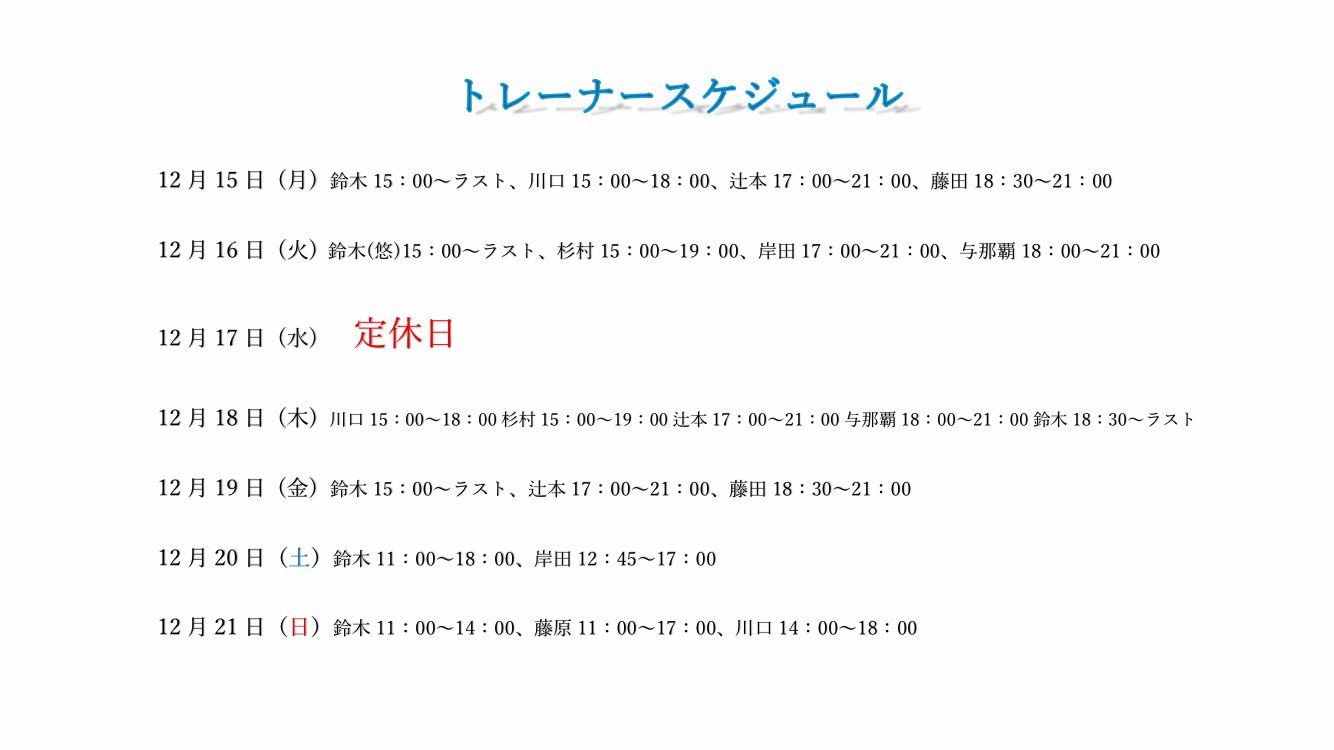 12月15日(月)〜12月21日(日)までのトレーナースケジュールになります!