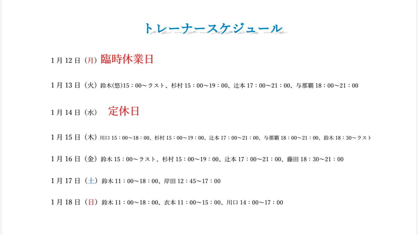 ホーム未分類 トレーナースケジュール 2026年1月10日 1月12日(月)〜18日(日)のトレーナースケジュール になります! ※12日(月)の祝日は臨時休業日となります。 お間違いのないようよろしくお願いいたします。 皆様のご来館お待ちしております