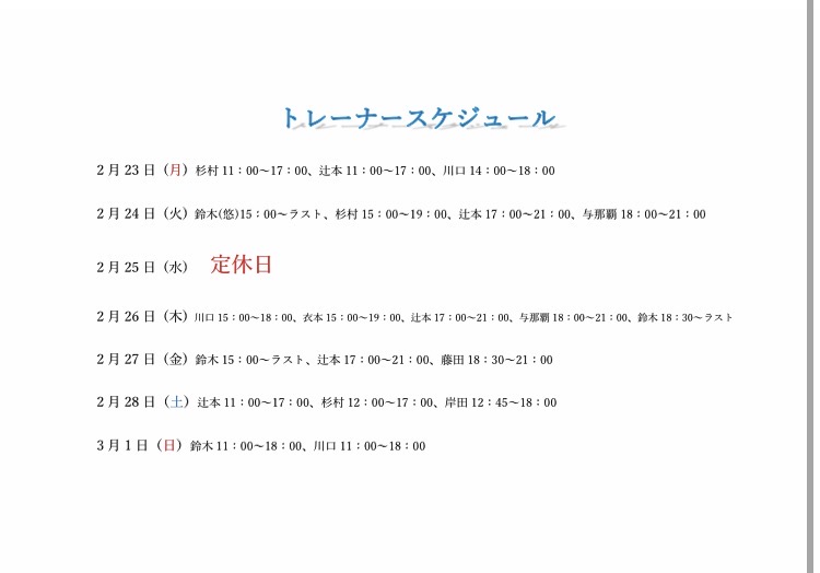 2月23日(月)〜3月1日(日)のトレーナースケジュール