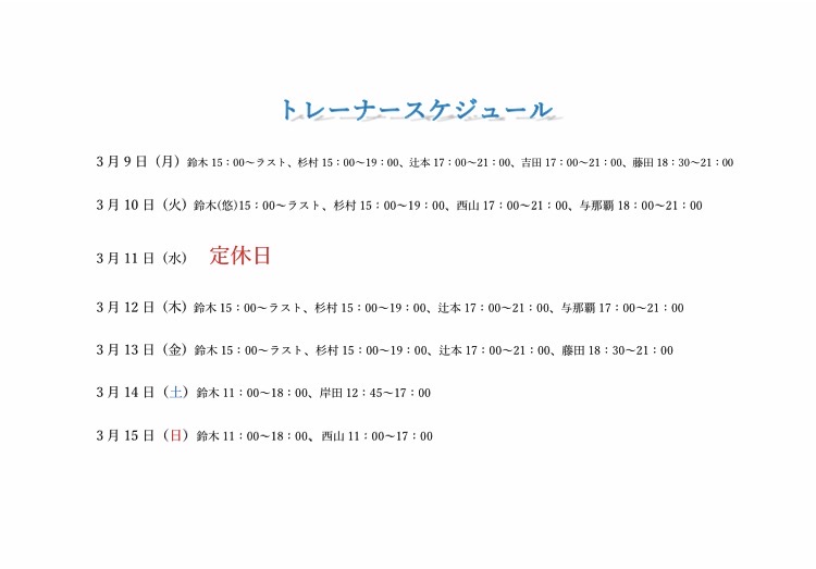3月9日(月)〜3月15日(日)のトレーナースケジュール