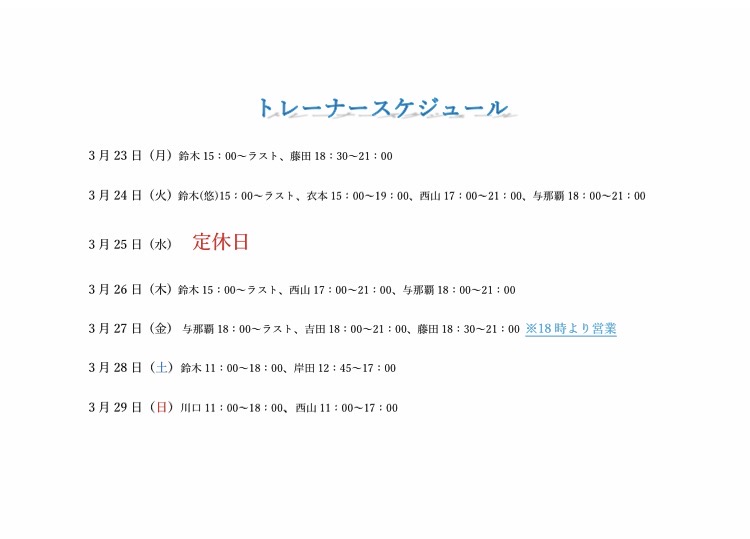 3月23日(月)〜3月29日(日)のトレーナースケジュール