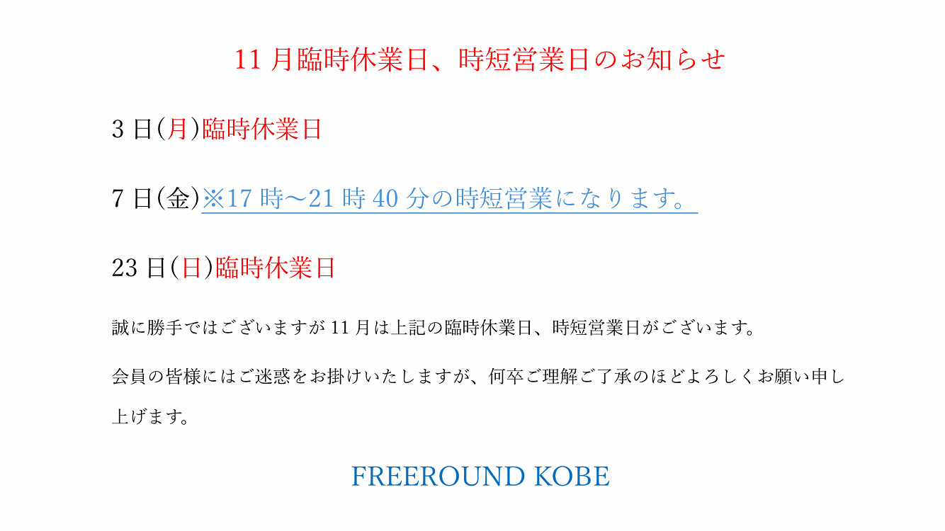 ホーム未分類 11月臨時休業日、時短営業日のお知らせ 2025年10月25日 11月臨時休業日、時短営業日のお知らせになります 会員の皆様にはご迷惑をお掛けいたしますが、 何卒ご理解ご了承のほどよろしくお願い申し上げます。